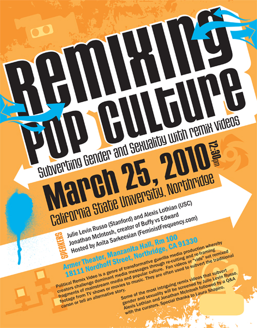 I have been busy organizing this great event coming up in March at California State University, Northridge. If you live in or are visiting the Los Angeles area you should come out and watch some of the most intriguing remix videos that subvert traditional gender and sexuality norms. The videos will be curated and presented by Julie Levin Russo, Alexis Lothian and Jonathan McIntosh. The screening will be followed by a Q&A with the curators. Special thanks to Laura Shapiro who consulted on the event.